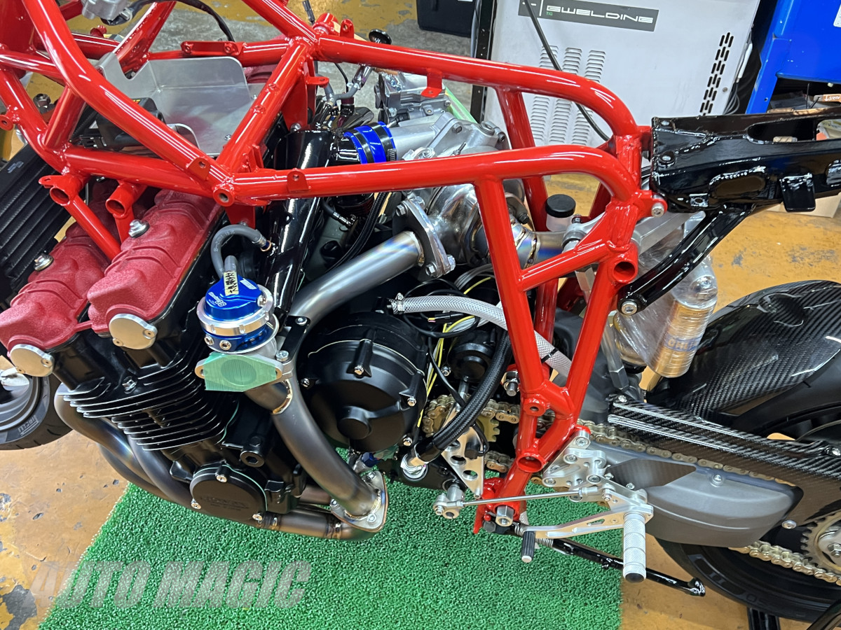 ・Mr,Turbo KITの排気パイプは左足のヒザ前の取り廻しでたが