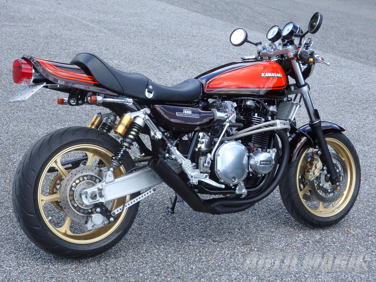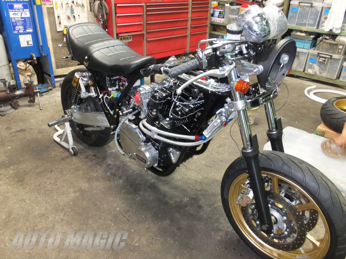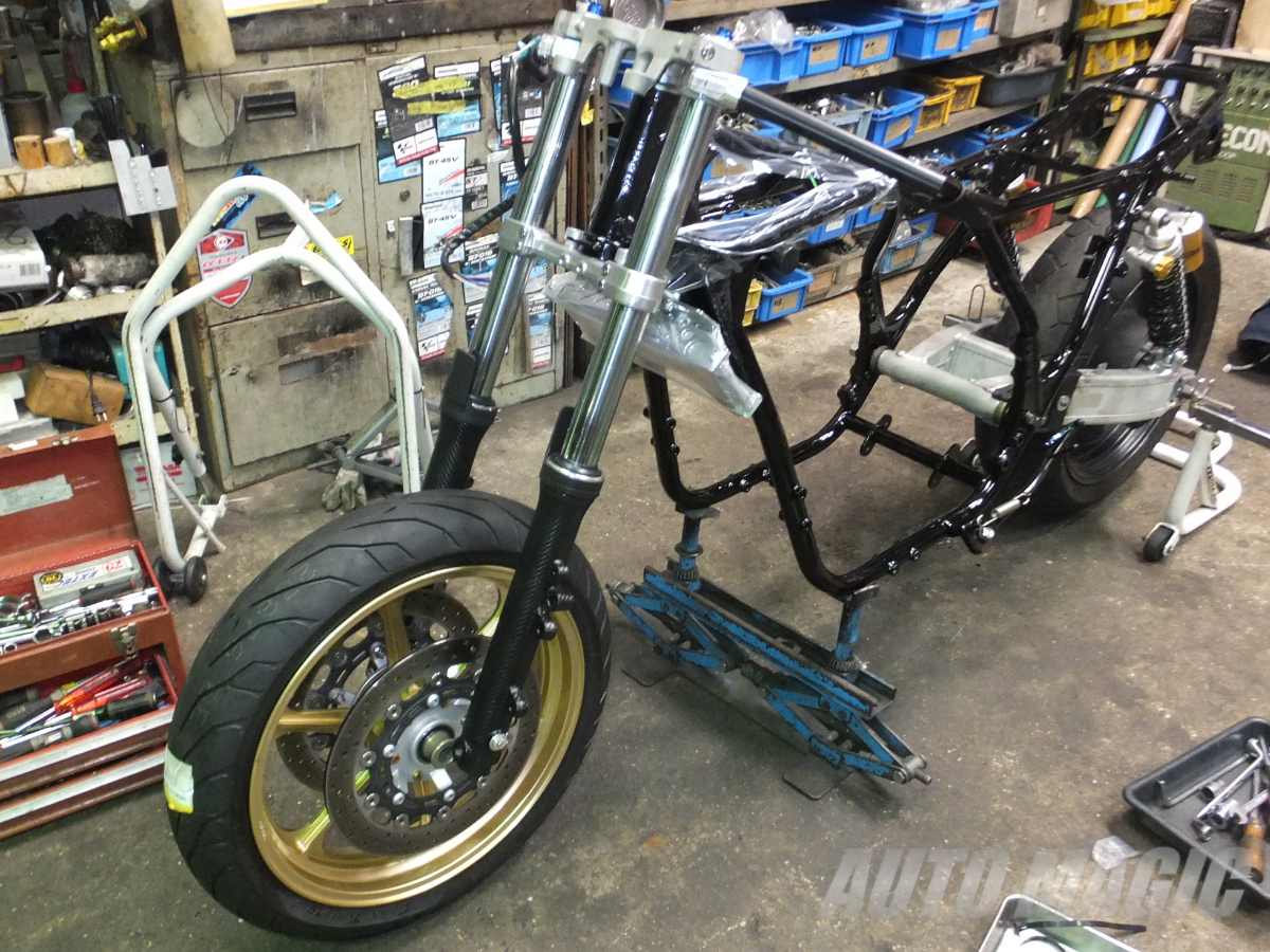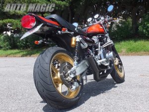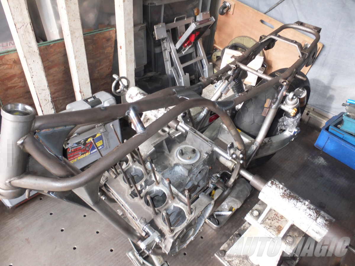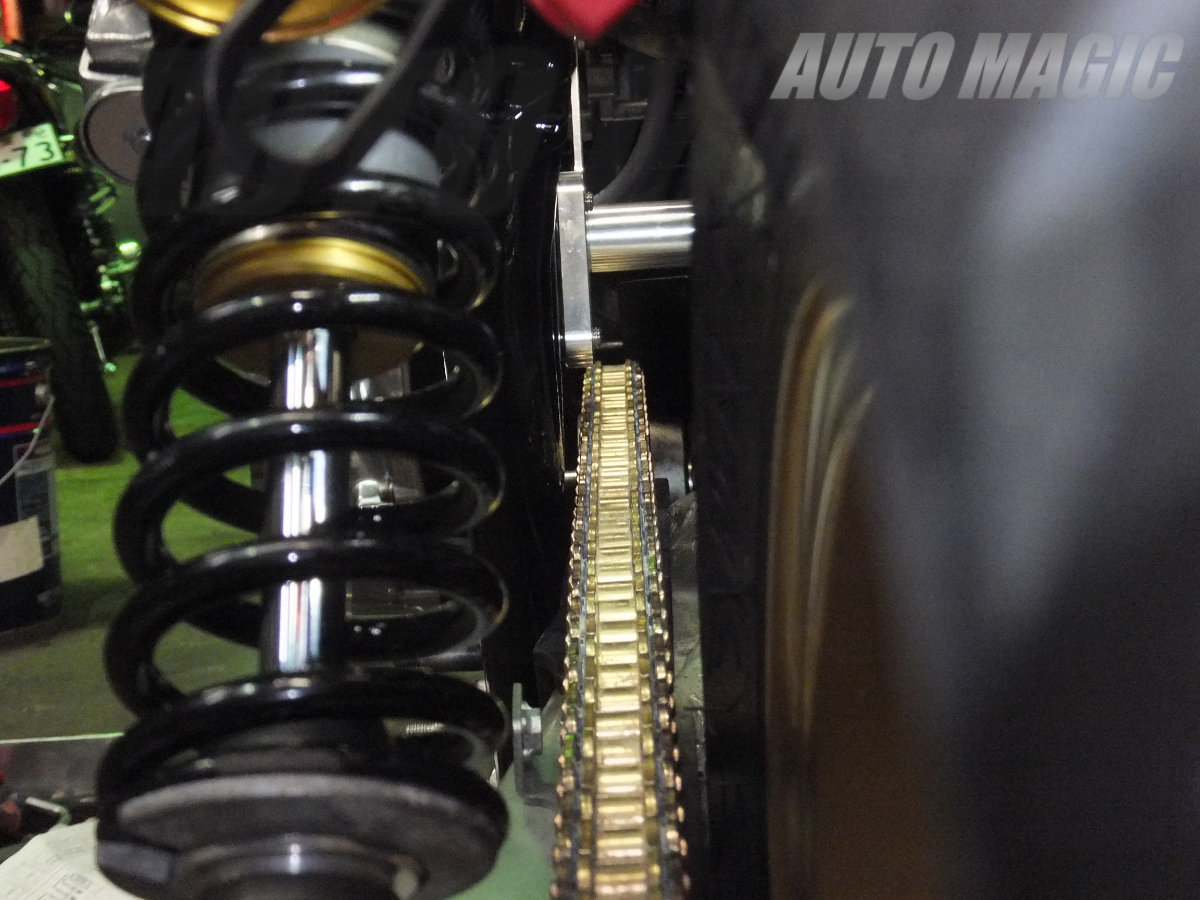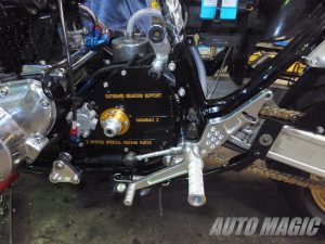 ・アンダーフレーム(ステム下からリヤサスアッパーマウントまで)がAutoMagicオリジナルのシームレスのクロモリパイプです。溶接性と強度を考慮した引き抜き材です。ノーマルより若干肉薄で軽量化で強度もあります。もちろんそれに合わせてアッパーフレームも独自の補強を施してます。エンジンを全てプレートでマウントする事でエンジンの搭載位置変更。さらに、搭載できるエンジンの選択肢も増えます。