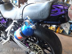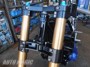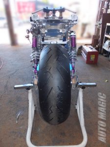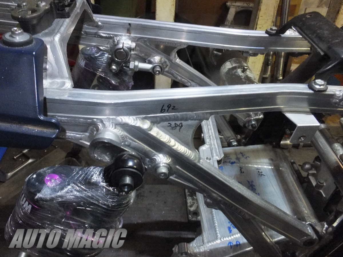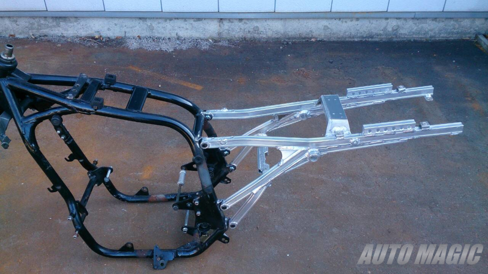 | ■入庫して頂いたべースマシンを ・ピポット広げ加工 ・脱着式アルミシートレール化 ・エンジンOVERHAUL ・足廻り換装 ・最近AutoMagicに多いワンオフ手曲げマフラー |