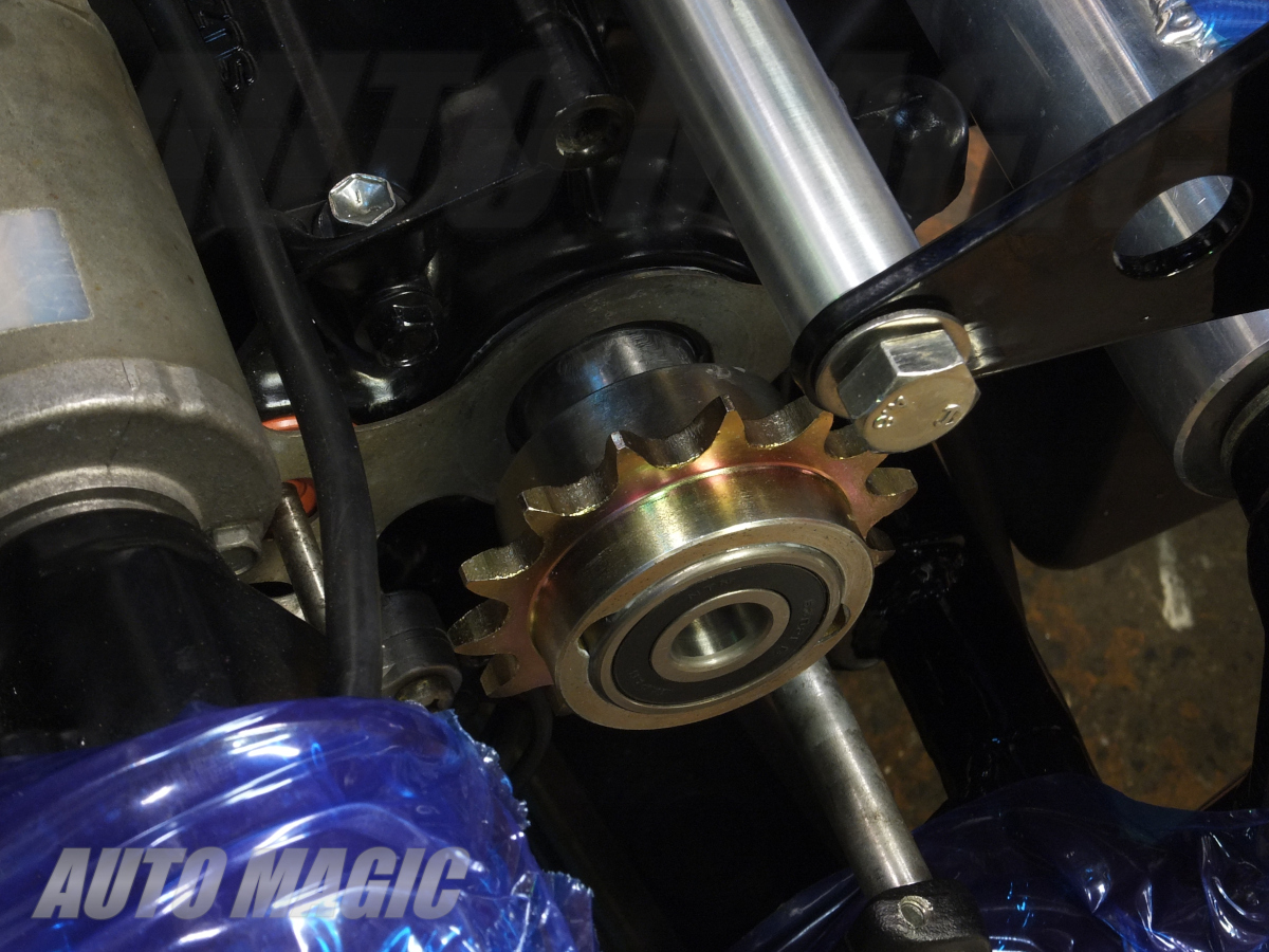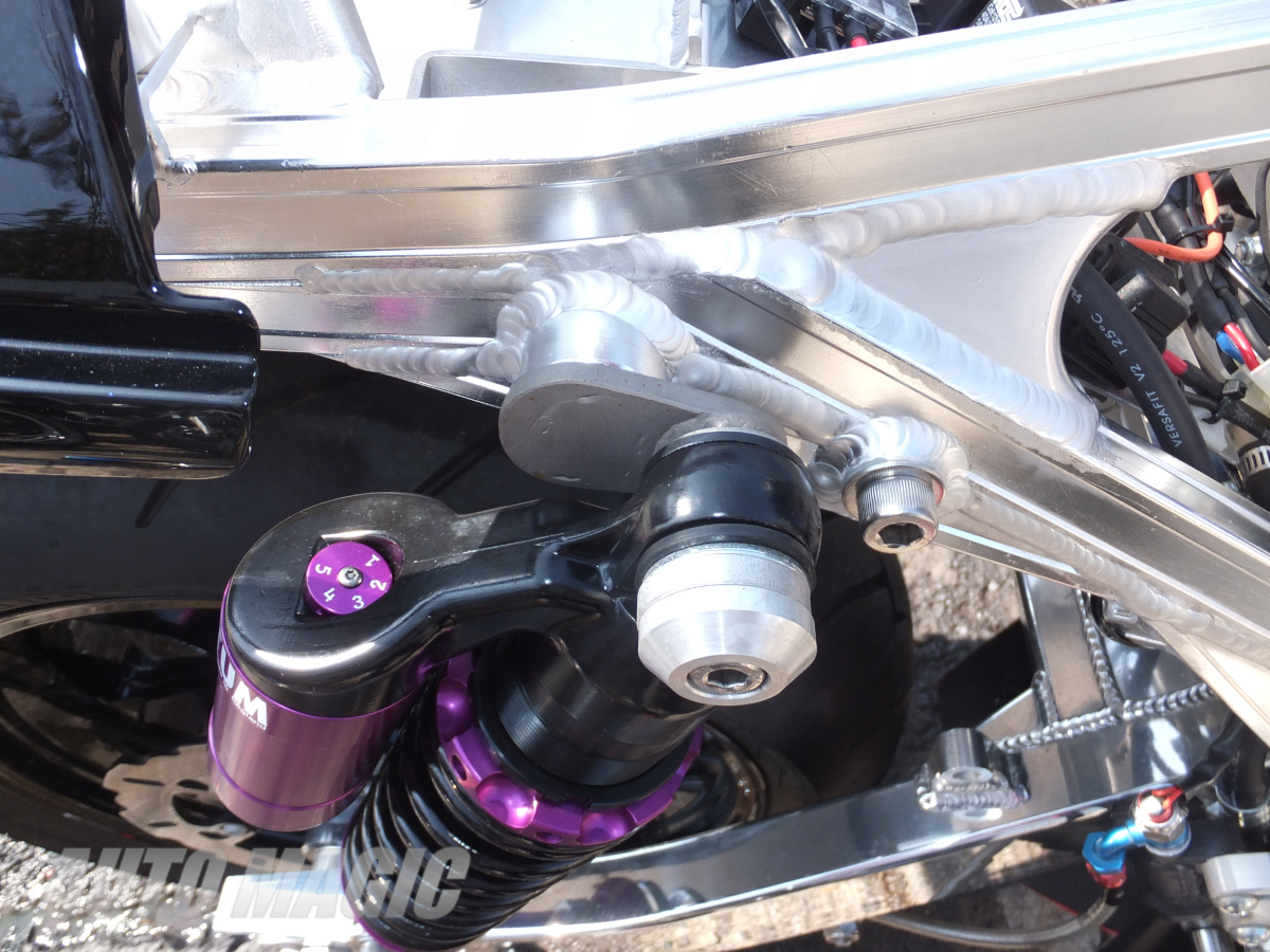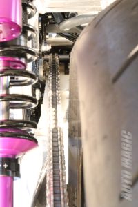 200タイヤでも、なんと余裕のチェーンライン! ピボットの内側をザグるなんてことはしません! ピポットの幅自体を広げます。 もちろんホイールはセンター! この作業は真似したくてもなかなかできません。 それ相当の ジグ、修正機、そして技術が必要です |
