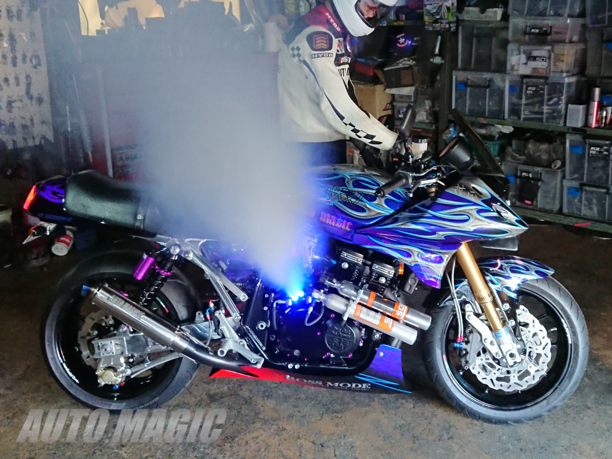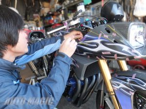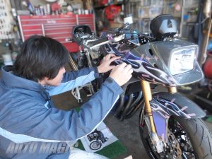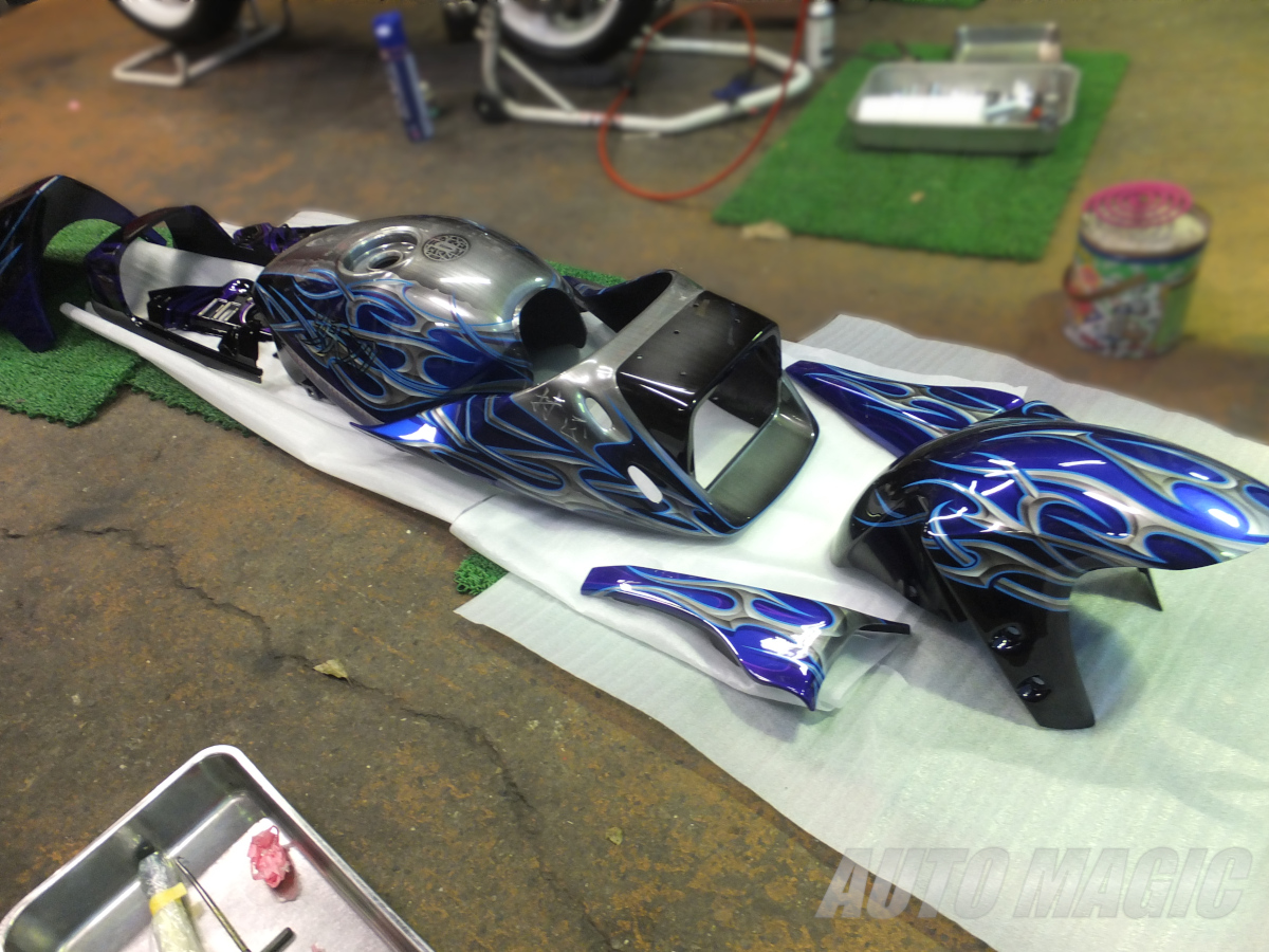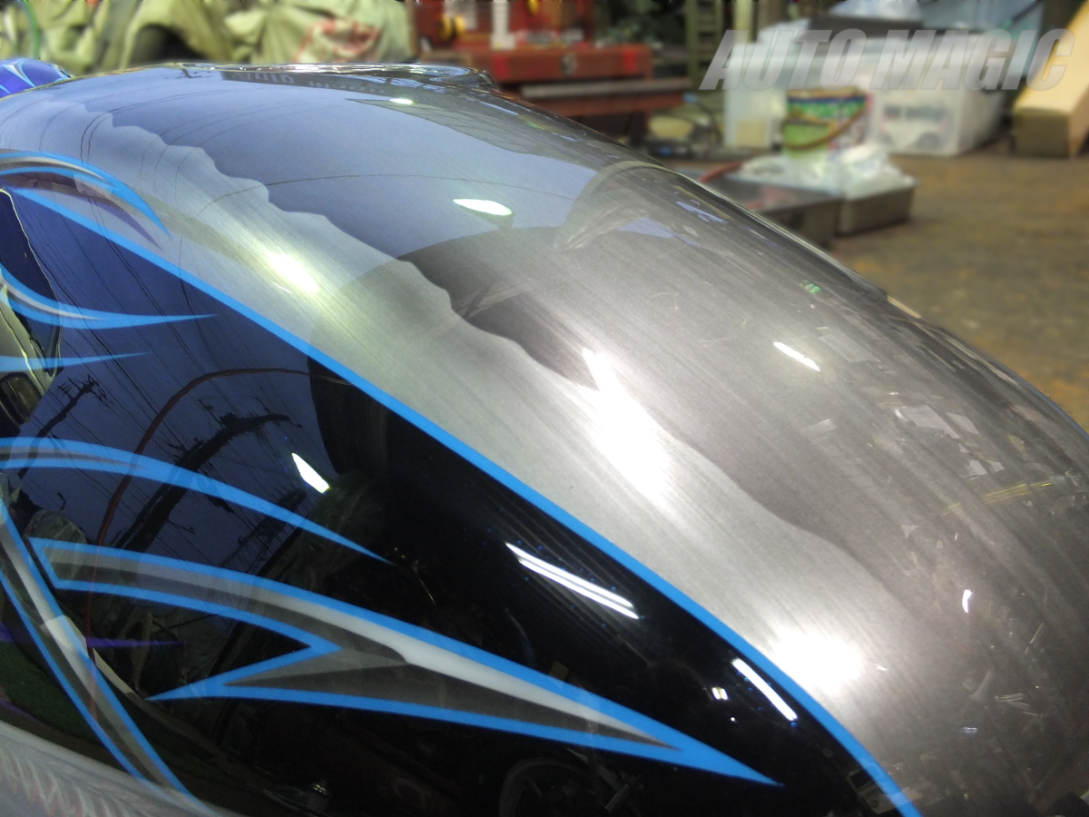 | 世界のYF-designに特注Paint依頼! もう30年近いお付き合いのYF-design深沢氏に、 もっとKatana(刀) もっと刃物 もっとシャープさ・・・を表現して・・・と ワガママをぶつけてみました(汗) YF-design初の試みでPaintでありながら 金属のヘアーラインを表現して頂きました♪ |