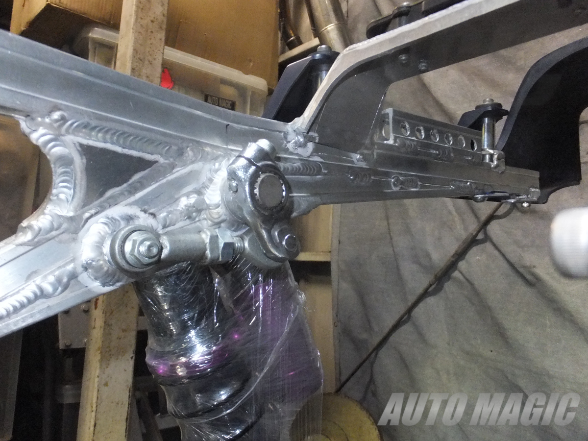 | 左右のリヤサスマウントはシートレールの内側にリンクを交わし長さ調整することで、 車高調整やレイダウン効果の調整ができる機能を発案! |
